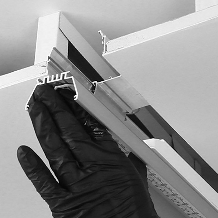 - Die MOD-KR-KOZE Trockenbau Alu-Schienen können in eine bestehende, vorgefertigte Gipskartondecke aus 12,5 mm Trockenbauplatten eingebaut werden.