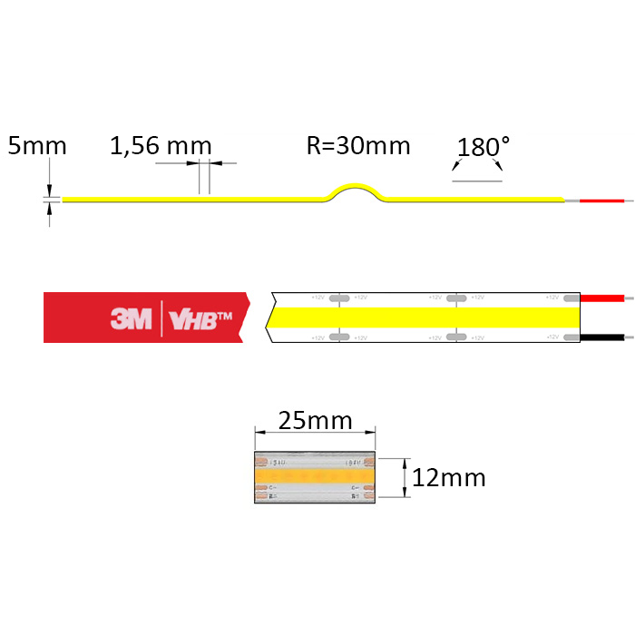 Auch das zugrunde liegende Material und die Struktur wurden sorgfältig ausgewählt. Der COB-CCT LED-Streifen 24V mit IP68 und der Bezeichnung: COB-CCT24640, ist auf einer gedruckten PCB (Printed Circuit Board) Verbindung mit einer Breite von 12mm, teilbar alle 2,5cm und einem Kupferanteil von 2OZ aufgebaut.