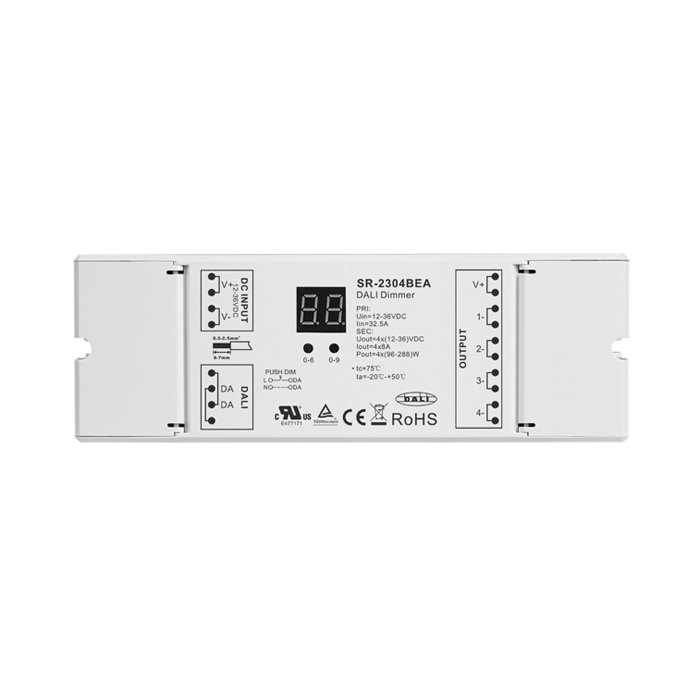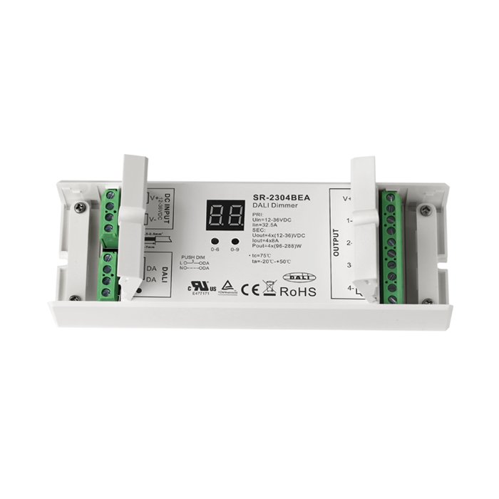 Der DIM-RGBW-DALI-Controller für LED-Lichtleisten (CCT, RGB, RGBW) bietet eine modulare Verwendung und gegenseitige Kompatibilität mit allen DALI-Systemen, die es Ihnen ermöglichen, komplexe Beleuchtungskonfigurationen mit verschiedenen Szenen zu erstellen. Wir fügen weitere charakteristische Merkmale des Dalisteuerungs-Controllers "SR-2304BEA" hinzu: