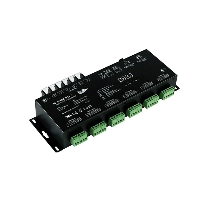 Der DMX512 Controller für LED-Streifen SR-2108B-M24-5 wurde so entwickelt, dass er fortgeschrittene Funktionen der Lichtsteuerung mit den neuesten Beleuchtungssystemen bietet. Das beigefügte #tablink#videa#Produktvideo## illustriert seine Verwendungsweise.