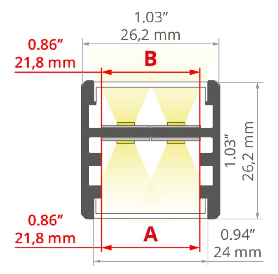 - Profilmaße für 2x LED-Streifen mit einer Breite von max. 10mm an jeder Seite (4x LED-Streifen insgesamt)
