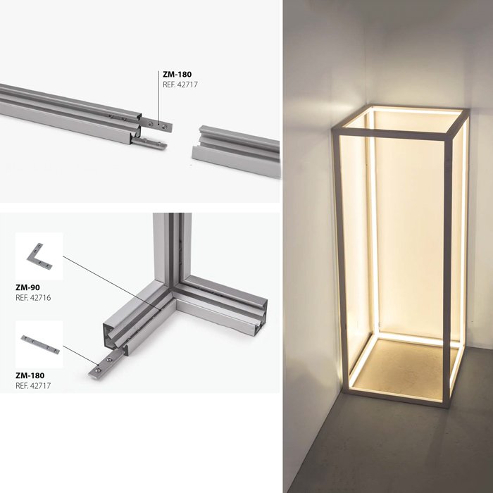 - "ZM" - ein kleines Schloss für die Möglichkeit, die Verbindungsstücke zu montieren. Mit Hilfe von Verbindungselementen können Sie einzelne LED-ALU-Eckleisten einfach in lange Linien und polygonale Formen verbinden.