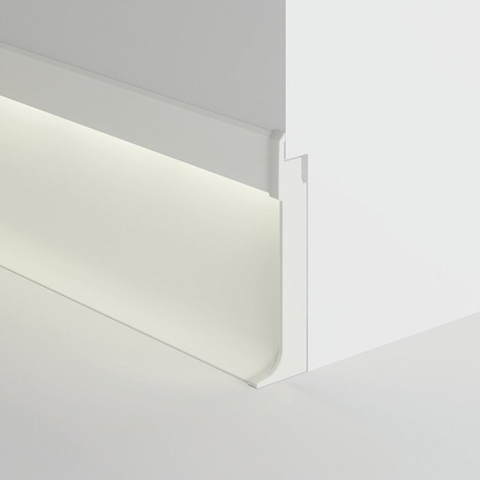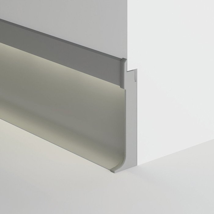 Wenn Sie nach einer Möglichkeit suchen, eine eingebaute Sockelleistenbeleuchtung mit einem LED-Streifen zu schaffen, dann kann die Alu-Leiste OLIS-K eine ideale Alternative für Sie sein. Sie sorgt für eine kompakte ästhetische Optik und hervorragende Lichteigenschaften je nach Konfiguration der Leuchte. Das Produktdesign prädestiniert sie für eine Verwendung als: