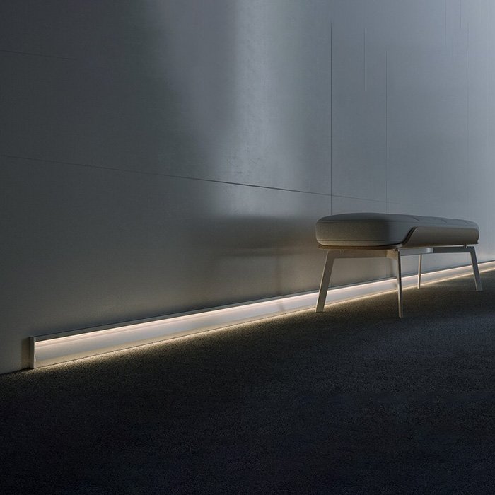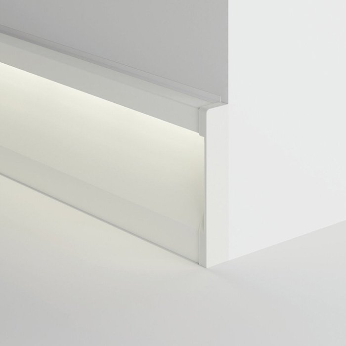 Wenn Sie nach einer Möglichkeit suchen, eine eingebaute Sockelleistenbeleuchtung mit einem LED-Streifen zu schaffen, dann kann die Alu-Leiste OLIS-K eine ideale Alternative für Sie sein. Sie sorgt für eine kompakte ästhetische Optik und hervorragende Lichteigenschaften je nach Konfiguration der Leuchte. Das Produktdesign prädestiniert sie für eine Verwendung als: