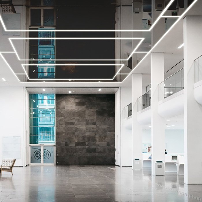 - Lineare Leuchte polygonaler Formen - in Form einer abgehängten oder eingebauten Leuchte in einer Spanndecke aus Folie.