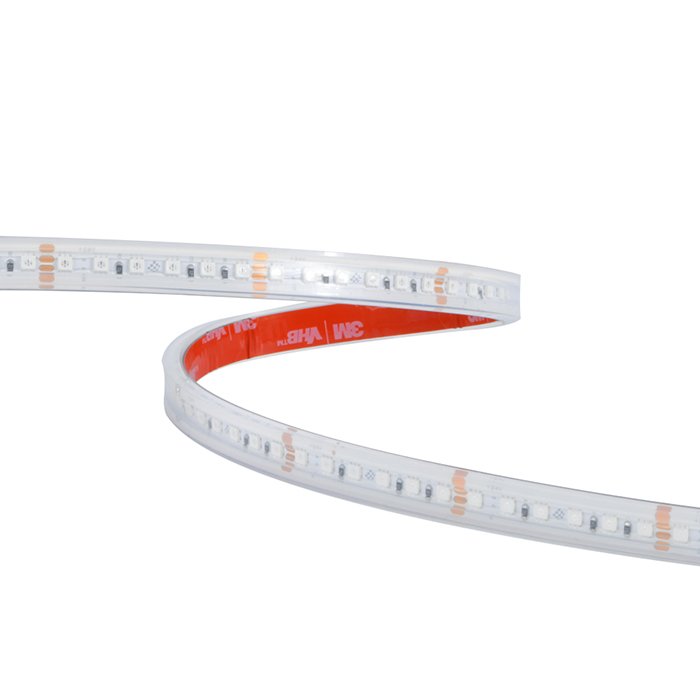 Die erhöhte Wasserdichtigkeit IP67 wird dadurch erreicht, dass der RGB-LED-Streifen in einem transparenten Silikongehäuse untergebracht ist. Der RGB-LED-Streifen in Silikon ist für den Einsatz im Badezimmer oder im Außen geeignet.