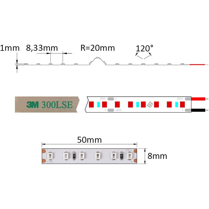 Das rote LED-Band mit der Bezeichnung "SC24120", ist auf einer Leiterplatte (Printed Circuit Board) mit einer Breite von 8mm, teilbar alle 5cm und einem Kupferanteil von 2OZ aufgebaut.