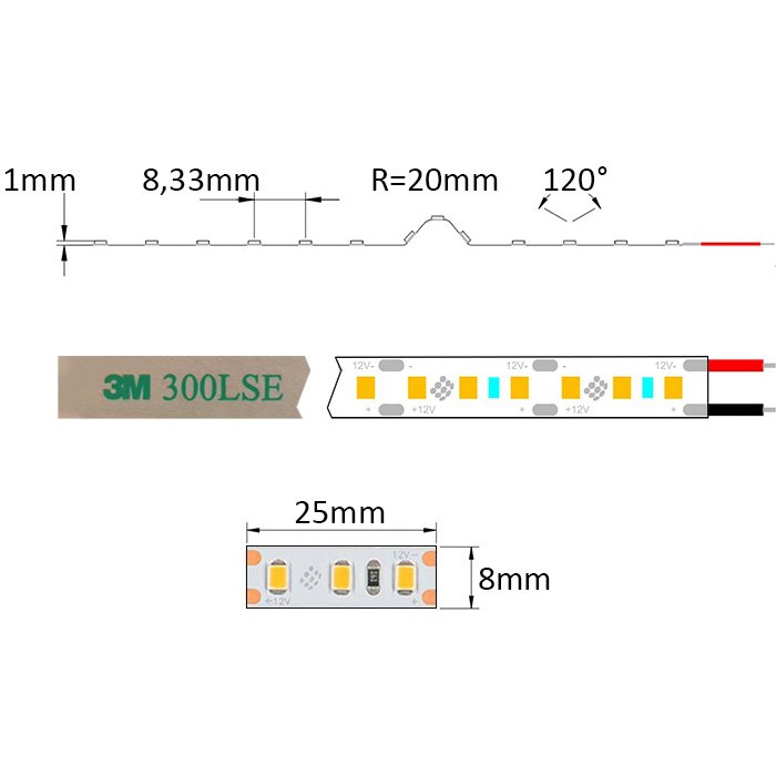 Auf der Unterseite der LED-Leiste - SC12120, finden Sie doppelseitiges Klebeband der höchsten 3M-Serie. Dies gewährleistet eine hervorragende Haftung auf der Aluminiumoberfläche, die typisch für LED-Profile ist. Wir empfehlen die Verwendung eines LED-Profils für die Installation eines LED-Streifens als die einzige und richtige Option.