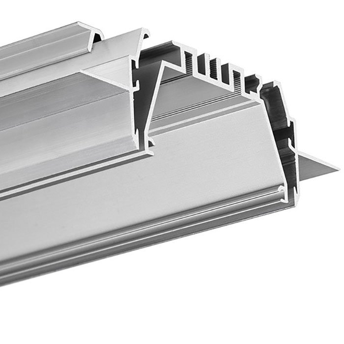 Das LED-Profil MOD-TEK-50 besteht aus mehreren Einzelteilen. Die Sichtteile sind eloxiert. Die Befestigungselemente sind nicht eloxiert - Rohaluminium. Bis zu drei LED-Streifen mit einer maximalen Breite von 10 mm können in das eloxierte Beleuchtungsteil eingebaut werden.