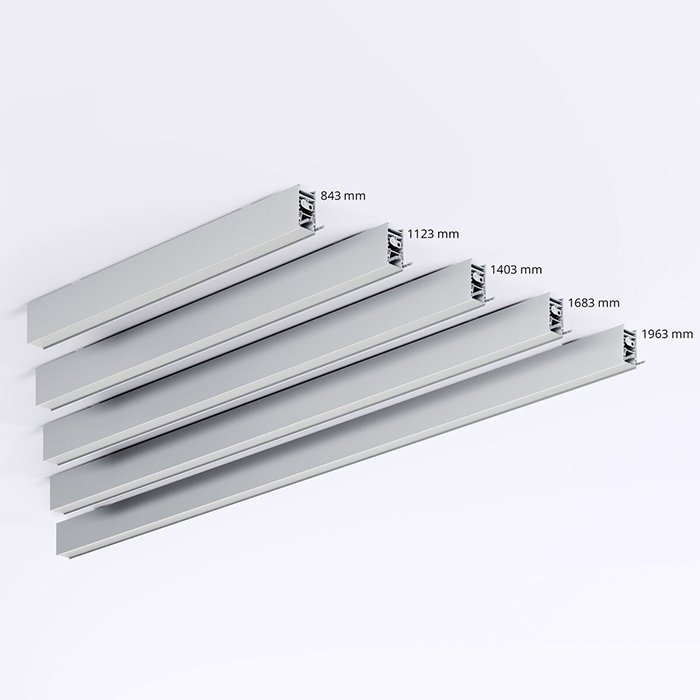 - die Länge einer Leuchte - gerade Module stehen in unterschiedlichen Längen zur Verfügung, was die Schaffung von Leuchten entsprechend den gewünschten Proportionen und der Größe eines Raums ermöglicht. Diese variablen Längen lassen sich verbinden, wodurch die Geschlossenheit des Designs erhalten bleibt.