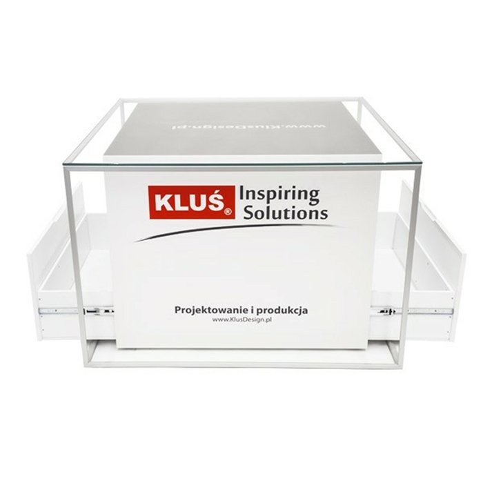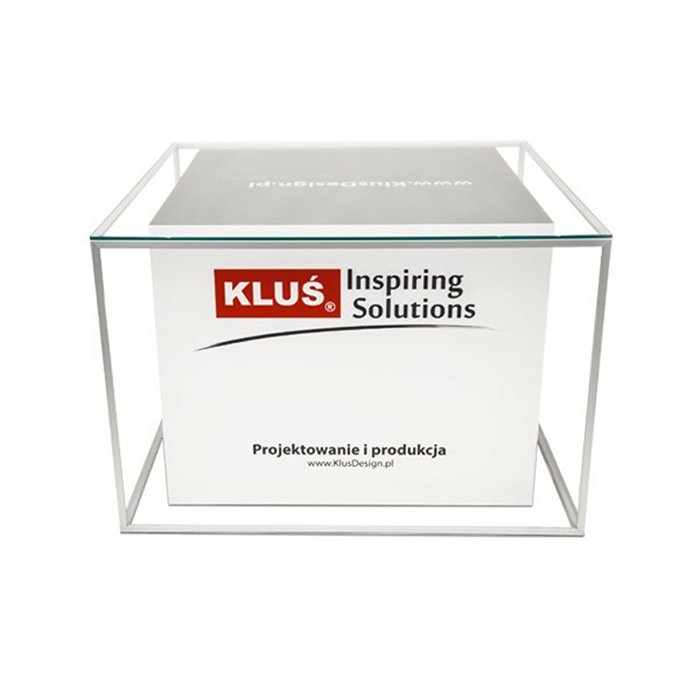 Der KLUŚ Ausstellungstisch ermöglicht eine einfache, attraktive und effektive Präsentation von Produkten. Der Tisch ist mit einer Elektroinstallation, mit der Möglichkeit des Anschlusses an eine 230V-Steckdose, ausgestattet.