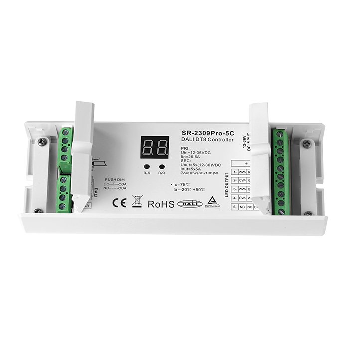 DALI Dimmer für LED-Streifen CCT, RGB, RGBW, RGBWW und einfarbig ist ein Gerät, das verwendet wird, um die Intensität und Farbmischung von LED-Streifen in Smart Home-Anwendungen für die Haushalts- oder Industrieautomation zu regulieren. Der RGB-DALI-Treiber für LED-Beleuchtung unterstützt die DALI-2 Version (DT6 und DT8). Ein weiterer Vorteil ist die Möglichkeit, den DALI-RGBW-Driver über einen DALI-PUSH-Dimmer steuern. In diesem Modus wird die Intensität aller Kanäle gleichzeitig eingestellt. Sie können den DALI-RGB-CCT Controller SR-2309PRO-5C für die folgenden Anschlussszenarien verwenden:
