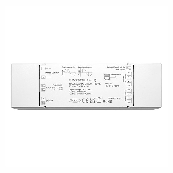 Der DALI, TRIAK, 0-1/10V Dimmer für LED-Streifen, 4in1 - Sunricher 1x20A "SR-2303P", ist ein Gerät zur Regelung der Intensität und Farbmischung der LED-Streifenbeleuchtung in Smart Home Anwendungen der Haus- oder Industrieautomation. Zur Steuerung der Ausgangsspannung DC 12V - 48V mit einer Last von 1x20A, können Sie das Eingangssteuersignal wählen: