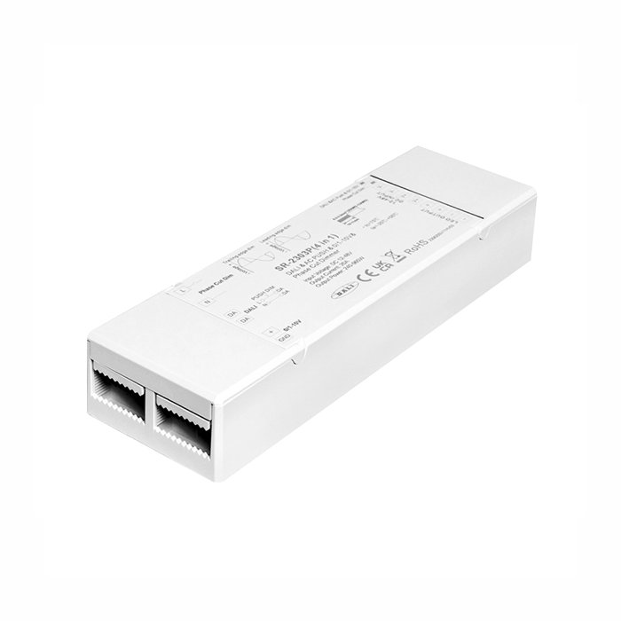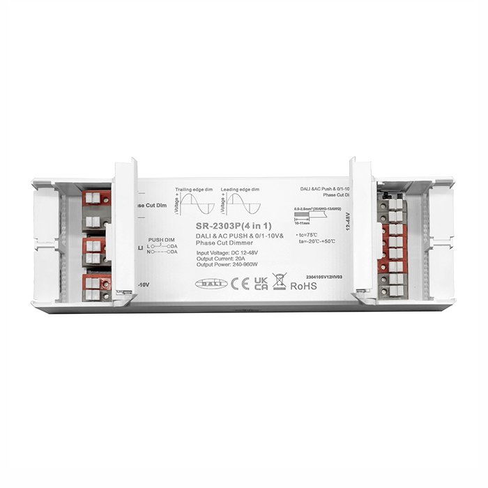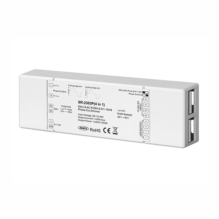 Der 0-10V-, TRIAK-, DALI-Universal-Dimmer für LED-Streifen bietet eine modulare Nutzung und gegenseitige Kompatibilität mit allen DALI-, TRIAK-, 0-1/10V-Systemen, was Ihnen ermöglicht, komplexe Beleuchtungskonfigurationen mit verschiedenen Szenen zu erstellen. Wir fügen weitere charakteristische Merkmale der "SR-2303P"-Licht-Dimmers hinzu: